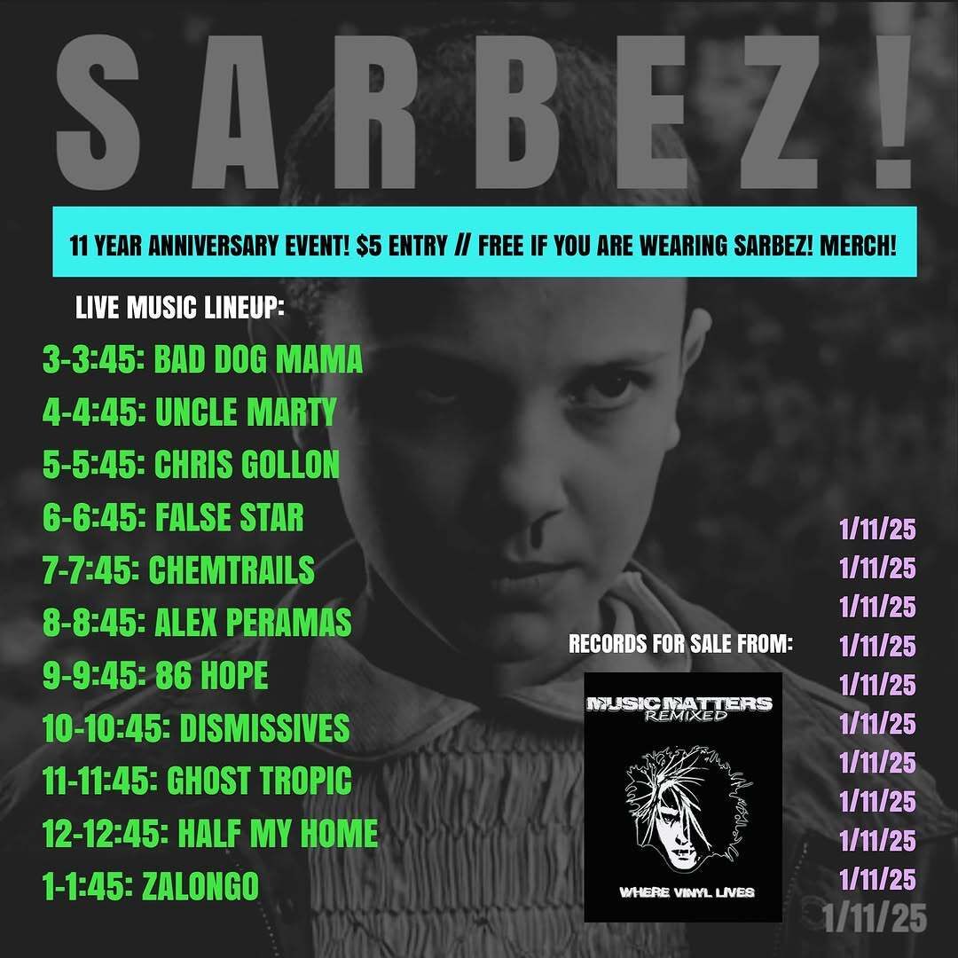 🎂 Sarbez! turns Eleven | Celebrate their eleventh bday with live music all day | $5 at the door, or free if you’re wearing Sarbez! merch | 3PM-2AM | 115 Anastasia Blvd